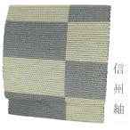 名古屋帯 信州紬 正絹 中古 帯 リサイクル ベージュ 紺 変わり市松 手織り 仕立て上がり カジュアル お洒落 紬 八寸 No.i6-2101
