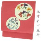 名古屋帯 型絵染 正絹 リサイクル 帯 中古 ピンク 秋草 女郎花 萩 カジュアル お洒落 九寸 単衣 付下げ 色無地 小紋 紬 No.i6-2107