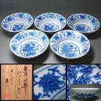 慶應◆本物保証【二代真葛香山】秀逸作 青華牡丹唐草に花鳥画 向付 圧倒的高雅な明染付写し! 五客 共箱付