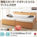 (タイムセール中) (組立設置付) 大容量収納付きチェストベッド ワイドK200ベッド マットレス付き 薄型スタンダードポケットコイル B+Cタイプ