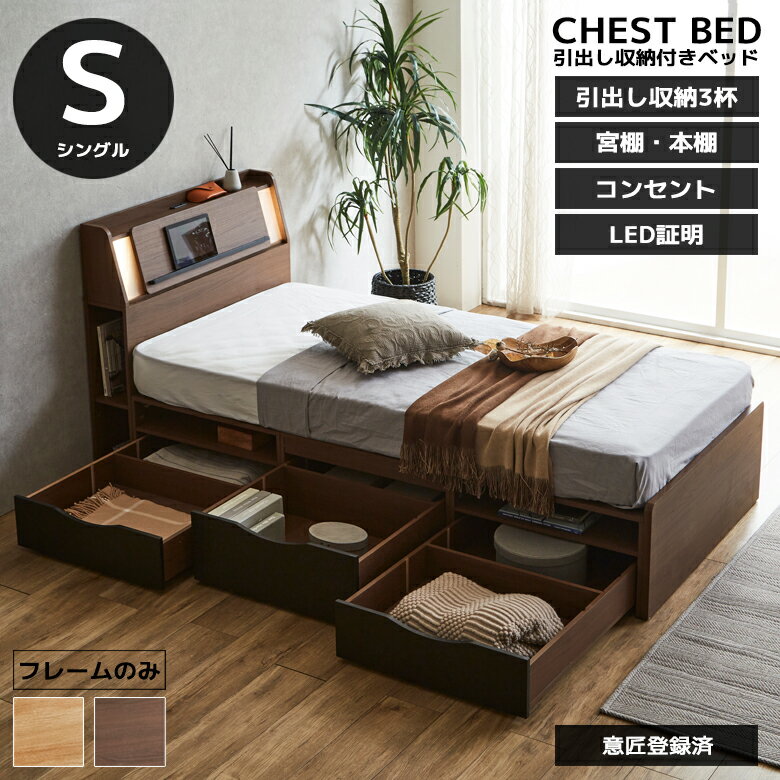 【全商品に使える12%offクーポンあり!!】 シングルベッド ベッドフレーム 収納付き ベッド シングル チェストベッド 大量収納 大容量 引き出し フレーム コンセント 収納 フレームのみ ライト付き 照明付き ダークブラウン ナチュラル コンセント付き