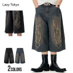 デニムパンツ メンズ ワイド バギー クロップド 7分丈 ジーンズ ジーパン 炎 ファイヤーパターン 刺繍 ヴィンテージ 古着風 黒 Lazy Tokyo 爆買
