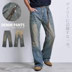 デニムパンツ メンズ アメカジ ストリート レトロ ヴィンテージ風 古着風 ウォッシュ加工 ユーズド加工 ストレート 微フレア ブーツカット スリム 細見え 美脚 トレンド コットン ストレッチ 普段使い ジーンズ ボトムス