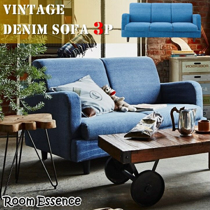 ヴィンテージスタイル デニムソファ 3P 3人掛け ジーンズ ソファ ブルーデニム ブラックデニム ビンテージ ソファー アメリカン カジュアル 男前 ソファ モダン 古着風 サーフィンスタイル デニム生地 ソファ 固めクッション AZNS