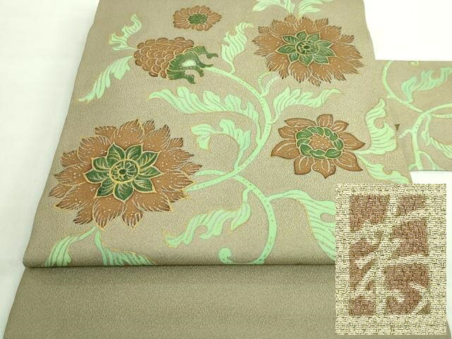 平和屋本店■超希少 品川恭子 九寸名古屋帯 更紗花文 利休茶色地 金彩 逸品 DZAA7957kh5