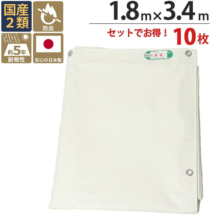 【10%OFF!スーパーSALE特価】 防炎シート 白 ホワイト 塩ビ + ポリエステル 1.8m×3.4m ホワイト 10枚1セット単位 ハトメ(ピッチ30cm) 継ぎ目なし 国産 1間 萩原工業 防炎 耐候性約5年 飛散防止 建築 新築 リフォーム 塗装 外壁 工事 安全 足場用 解体 溶接 壁面 床面