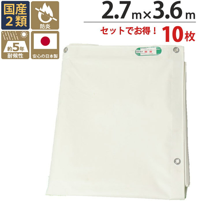 【10%OFF!スーパーSALE特価】 防炎シート 白 ホワイト 塩ビ + ポリエステル 2.7m×3.6m ホワイト 10枚1セット単位 ハトメ(ピッチ45cm) 継ぎ目なし 国産 萩原工業 防炎 耐候性約5年 飛散防止 建築 新築 リフォーム 塗装 外壁 工事 仮設 安全 足場用 解体 溶接 壁面 床面