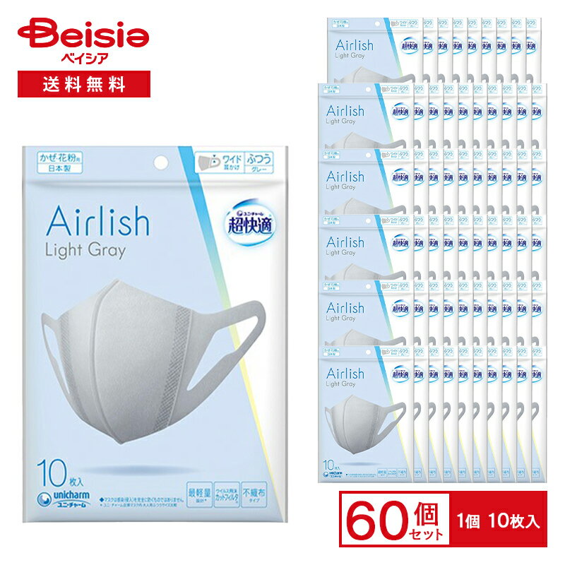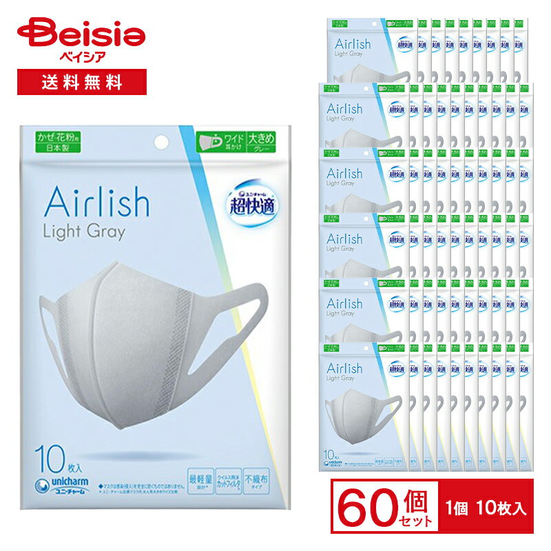 ユニ・チャーム(unicharm) 超快適マスク Airlish ふつう グレー 10枚 x60 | 超快適マスク Airlish ふつう グレー 夏用マスク 通気性 蒸れにくい 小顔