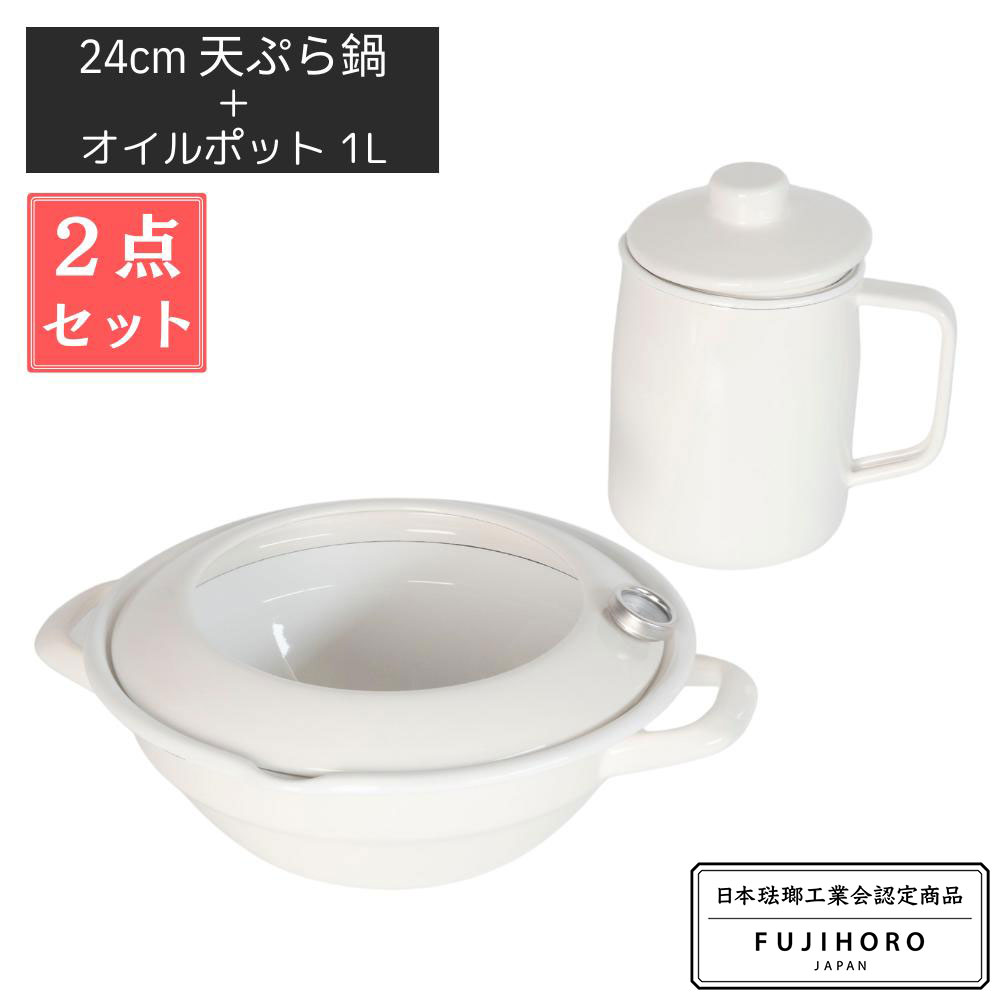【安心のメーカー直販】富士ホーロー 天ぷら鍋オイルポットセット 温度計付き 24cm 琺瑯 ホワイト 白 ih対応 揚げ鍋 キッチン用品 両手鍋 てんぷら鍋 揚げ物