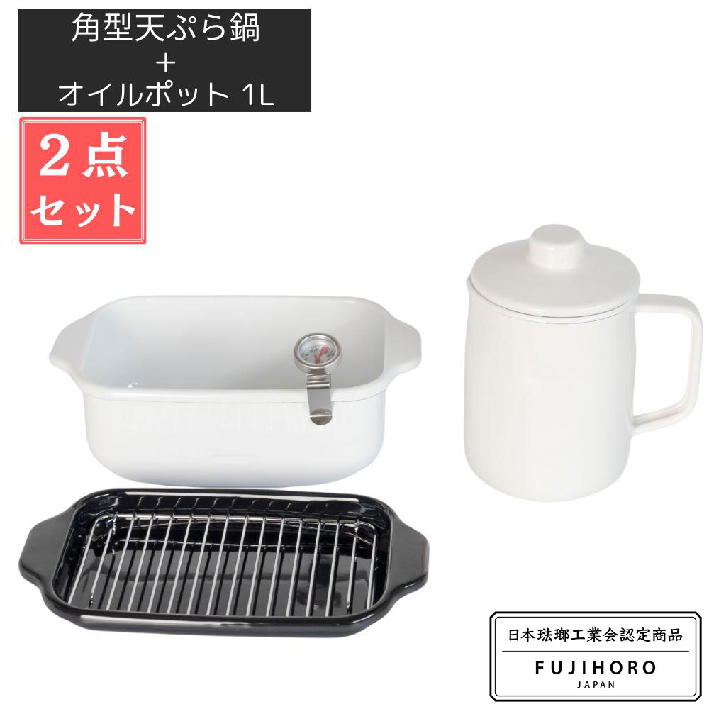 富士ホーロー 角型天ぷら鍋 オイルポット0.8L 2点セット 温度計付き バット付き ih対応 天ぷら鍋 ミニ 四角い ホーロー鍋 角型 スクエア 揚げ物用 鍋 揚げ物 鍋 揚げ鍋 油こし 油こし器 油ポット 公式認定ショップ
