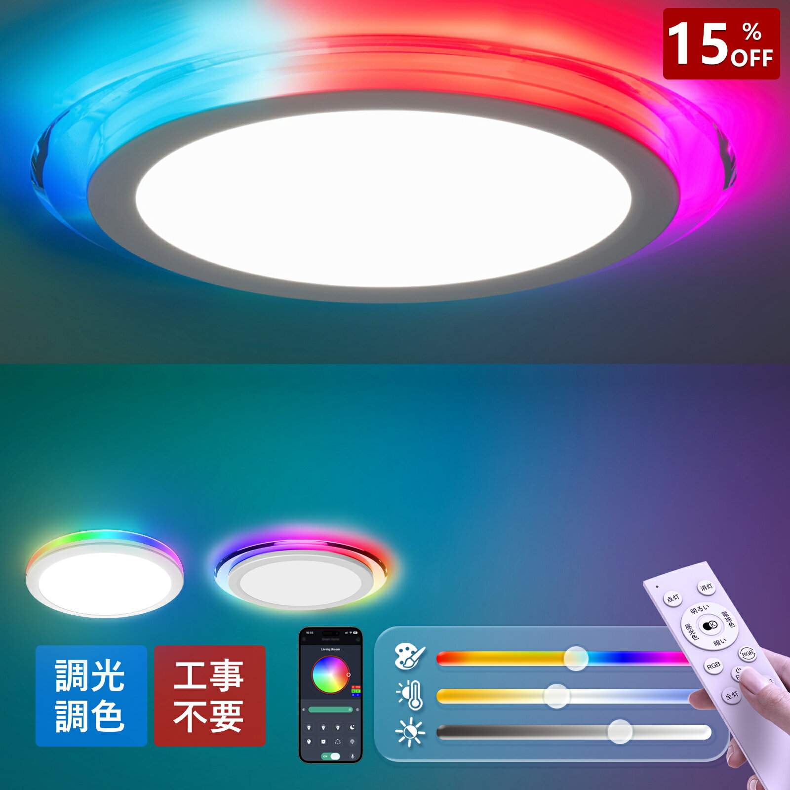 【10%OFF】led シーリングライト 6畳 8畳 led 節電 おしゃれ 調光調色 北欧 常夜灯 RGB 照明 LEDライト 省エネ 電気 明るい 天井照明 リモコン付き APP対応 タイマー インテリア 和室 洋室 居間 寝室 リビング 照明器具 工事不要
