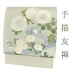 名古屋帯 正絹 緑 菊 流水 手描き友禅 塩瀬 仕立て上がり リサイクル カジュアル お洒落 開き名古屋帯仕立て No.i6-2301