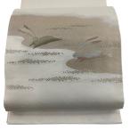 袋帯 逸品 加納幸 落款あり 証紙あり ウサギ 霞 金糸 箔 灰白 お太鼓柄 正絹 中古
