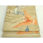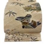 袋帯 逸品 人間国宝 羽田登喜男 落款あり 鴛鴦 松竹梅 金糸 箔 ベージュ お太鼓柄 正絹 中古