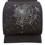 袋帯 逸品 蜘蛛の巣 葉柄 銀糸 刺繍 灰茶 お太鼓柄 正絹 中古