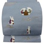袋帯 逸品 うさぎ 草花 金銀糸 刺繍 青灰色 お太鼓柄 正絹 中古