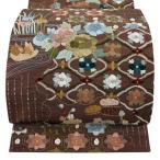 美品 袋帯 逸品 鴛鴦 草花 刺繍 金糸 茶色 六通 正絹 中古