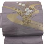 美品 名古屋帯 優品 牡丹 流水 金糸 箔 灰紫 正絹 中古