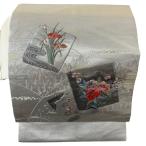 名古屋帯 優品 色紙 草花 金銀糸 箔 クリーム 正絹 中古