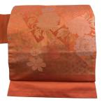 美品 名古屋帯 優品 関西仕立て 牡丹唐草 菱文 箔 オレンジ 正絹 中古
