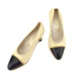 【初売りSALE★30%OFFクーポン】シャネル パンプス シューズ 靴 レディース ♯34ハーフ チェーントゥ バイカラー ベージュ ブラック ゴールド 中古