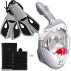 フルフェイスシュノーケルマスク 子供用 調節可能なスイムフィン付き 180度パノラマビュー シャークシュノーケリングマスク 子供用 シュノーケリングギ