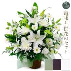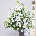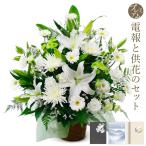供花 「お供えアレンジセレモニー」 プレミアムカード電報セット 弔電 お供え花 フラワー 白 ユリ 仏花 枕花 生花 お悔やみ 葬儀 法要 法事 一周忌