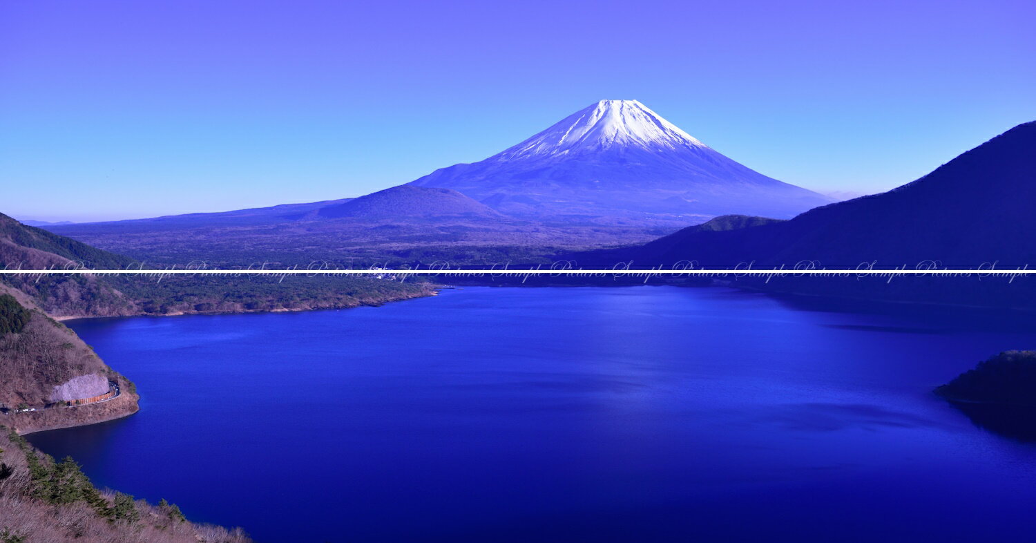絵画風 壁紙ポスター (はがせるシール式) 【特大上下2枚仕様】日の出を迎えた初春の本栖湖と神秘的な富士山 千円札裏の絶景ポイント《写真家/三浦金徳》 キャラクロ M-FJS-009X1W(パノラマX版 2210mm×576mm×2枚)<日本製> ウォールステッカー お風呂ポスター