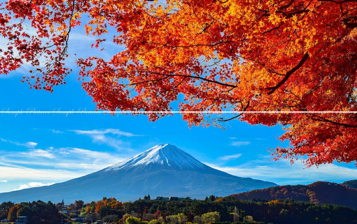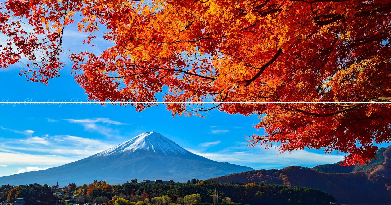 絵画風 壁紙ポスター (はがせるシール式) 【特大上下2枚仕様】-地球の撮り方- 河口湖の紅葉まつりと富士山《写真家/糸氏雄一郎》 キャラクロ C-ZJP-036L1W (パノラマL版 1843mm×576mm×2枚)<日本製> ウォールステッカー お風呂ポスター