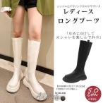 ロングブーツ レディース ロング丈 プラットフォーム サイドゴム シューズ 厚底 PU ブラック ハイヒール 美脚 寸胴 おしゃれ 履きやすい 歩きやすい