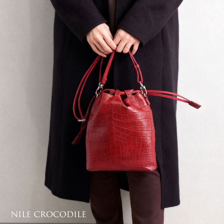 【5%offクーポン】クロコダイル 巾着バッグ マット 加工 ナイルクロコダイル レディース 2way 巾着 ポーチ A5対応 薄型 軽量本革 鰐革 保証書 付き 斜め掛け ショルダーバッグ プレゼント ギフト 4FA(06001961r)