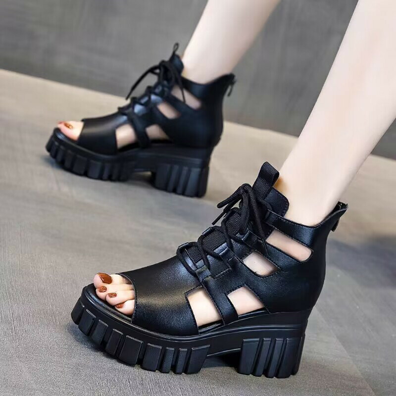 【3点15%offクーポン配布中! 真っ黒 厚底サンダル ブーツサンダル サマーブーツ ウエッジソール グラディエーター 軽量 ハイヒール レースアップ 編み上げサンダル レディース靴 夏 オープントゥ サンダル 厚底靴 ハイカット スニーカー 歩きやすい 美脚効果