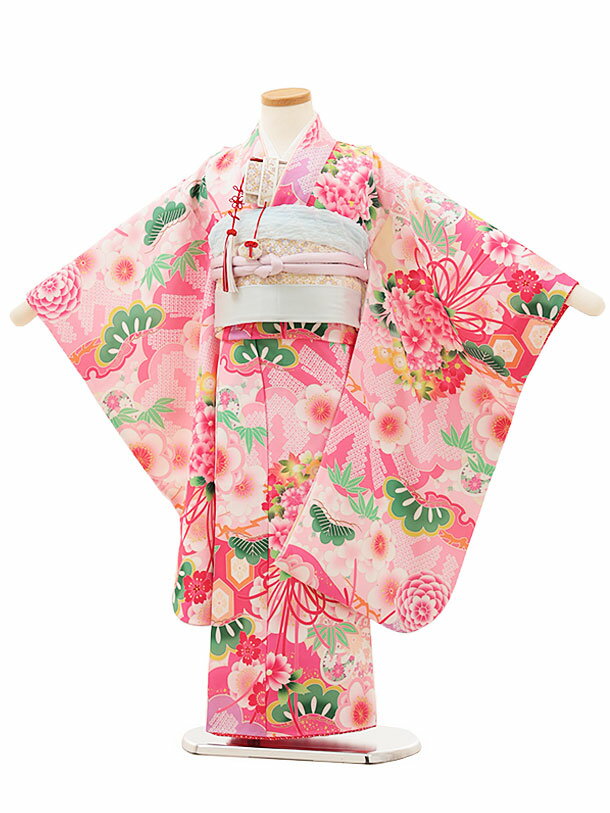 【レンタル】着物 七五三(5歳女の子結び帯)0642 ピンク 梅に薬玉 5歳 結び帯 フルセット 女の子 お祝い着 正月 5才 女児 きものレンタル〔往復送料無料〕