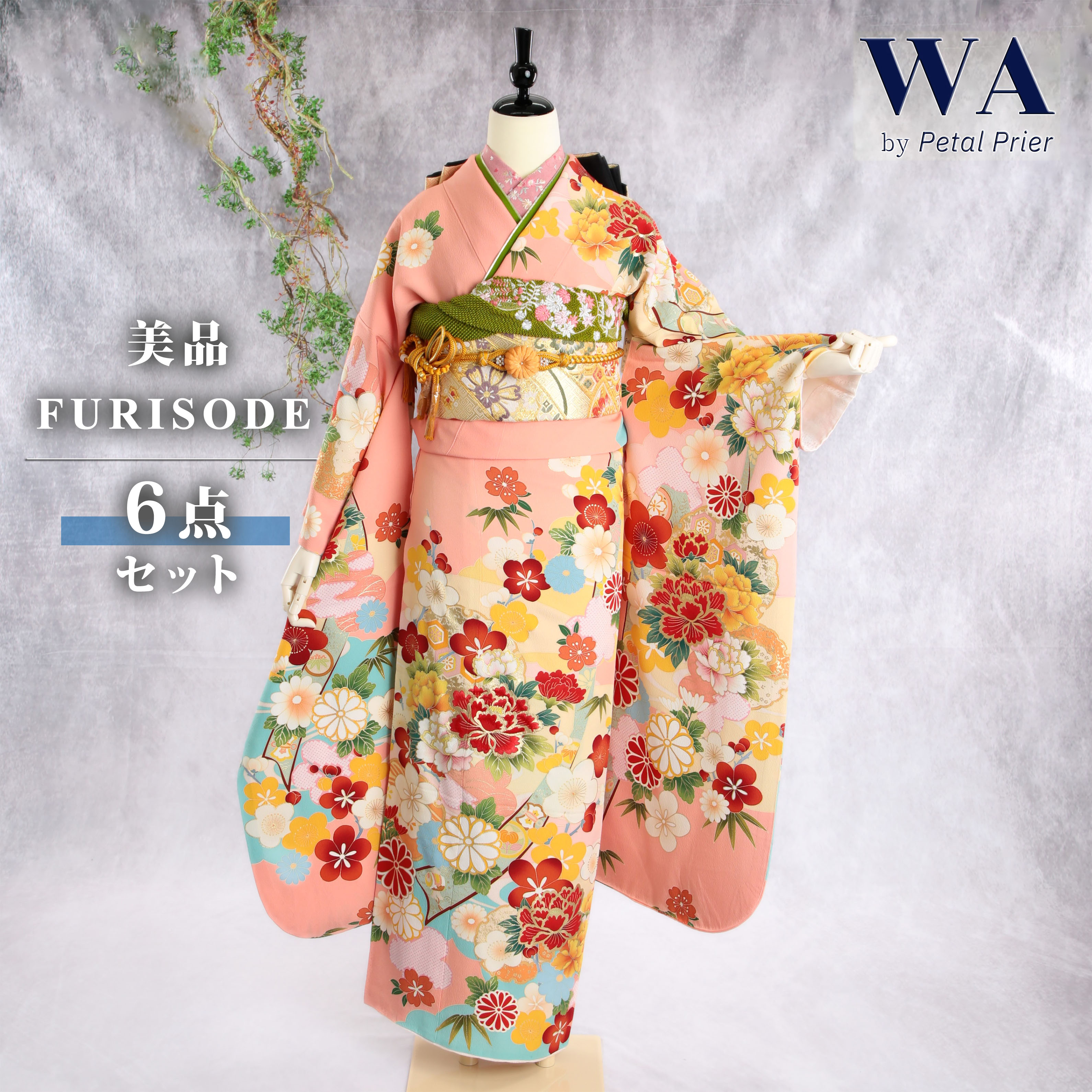 \30%OFF!/【中古】振袖 6点セット L〜LLサイズ 振袖セット 振袖フルセット フルセット 成人式 着物 晴れ着 ピンク 古典 エレガント 牡丹 帯 帯揚げ 重衿 半衿 帯締め 結婚式 ブライダル 十三参り FN-225