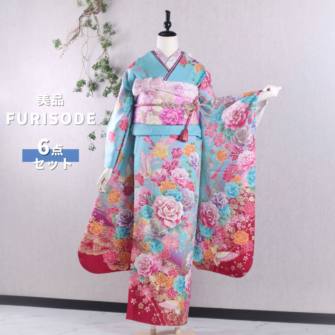 \30%OFF!/【中古】振袖 6点セット S〜Mサイズ 振袖セット 振袖フルセット フルセット 成人式 水色 バラ 蝶 着物 晴れ着 白色 新古典 桜 毬 熨斗 帯 帯揚げ 重衿 半衿 帯締め 結婚式 ブライダル 十三参り FN-315