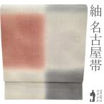 名古屋帯 紬 九寸 全通 正絹 染め帯 手織り 手染め ぼかし染 グレー 淡赤 市松 カジュアル 美品 新古品 仕立て上がり みやがわ sb55098