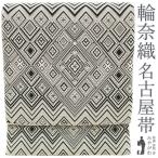名古屋帯 京都 西陣 輪奈織 刺し子風 八寸 正絹 全通 金糸 黒 白 菱 幾何学文様 カジュアル 春 秋 冬 中古 仕立て上がり みやがわ sb55108