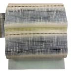 名古屋帯 逸品 紬地 縞 格子 青灰色 正絹 中古