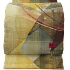 美品 名古屋帯 逸品 渡文 落款あり 八寸名古屋帯 トンネル仕立て 幾何学 黄土色 正絹 中古