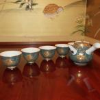 茶道具 茶器(急須・碗5ヶ入)九谷焼 本金青粒牡丹 錦泉作