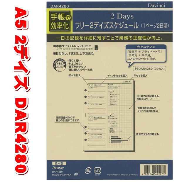 システム手帳 リフィル A5 フリー2デイズスケジュール 2日 日付なし デスクサイズ 6穴 レフィル ダヴィンチ DAR4280 【ネコポス便対応】