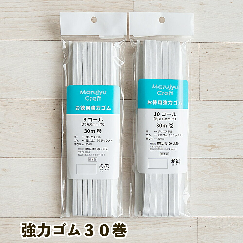 【セール10%OFF】ゴム 強力ゴム お徳用 大容量 8コール 10コール【30m】白 ホワイト 手芸 洋裁用 肌着 パジャマ インナー スポーツウェア ウエストゴム 日本製【手芸の丸十オリジナル】
