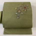 美品 名古屋帯 秀品 華文 草花 刺繍 金糸 抹茶色 正絹 中古