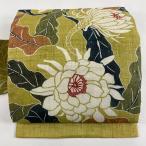 名古屋帯 逸品 栗山吉三郎 落款あり 草花 抹茶色 麻 中古