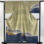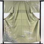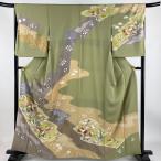 訪問着 身丈170cm 裄丈67.5cm L 袷 草花 流水 金彩 染分け 抹茶色 正絹 美品 名品 中古