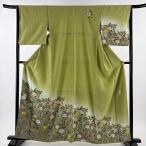 美品 訪問着 身丈163.5cm 裄丈66cm M 袷 落款あり 菊 萩 ぼかし 抹茶色 正絹 名品 中古