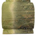 美品 袋帯 名品 落款あり 自然の恵み 緑風 緑茶染 葉柄 幾何学模様 金糸 抹茶色 全通 正絹 中古