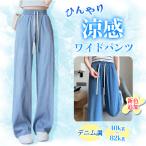 新色追加 涼感ワイドパンツ デニム調 接触冷感 ロング クール 涼しい 夏用 ゆったり 薄手 体型カバー ウエストゴム ボトムス 着痩せ 美脚 爆買