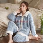パジャマ レディース 冬 かわいい 長袖 ルームウェア もこもこ 寝巻き 女性用 ふわふわ 前開き 裏起毛 韓国風 上下セット 部屋着 プレゼント 暖かい