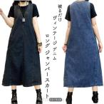 デニム ロング ジャンパースカートレディース マキシ ビンテージ ユーズド感 ジャンスカ 洗い ウォッシュ ゆったり Aラインシルエット 被るだけ ブラック イン